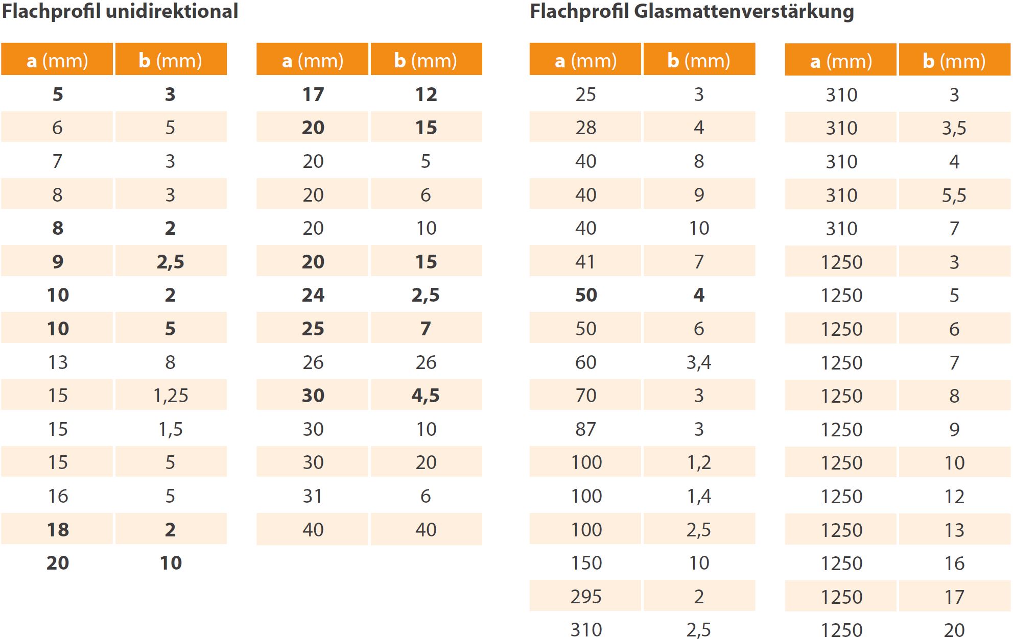 GFK-Flachprofile aus glasfaserverstärktem Kunststoff werden im Pultrusionsverfahren hergestellt.Unsere pultrudierten/stranggezogenen GFK-Profile sind zum Teil ab Lager verfügbar und kommen in den unterschiedlichsten Anwendungen zum Einsatz. Es wird zwischen unidirektional hergestellten Flachprofilen und mit Glasmattenverstärkung hergestellten Flachprofilen unterschieden. Flachprofile sind für verschiedenste Anwendungsarten vorgesehen. Sie dienen als Verstärkung in Marmorplatten, Küchenplatten, Türfüllungen oder als Abstandshalter in Transformatoren. Im nautischen Bereich kommen sie als Segellatten zum Einsatz. GFK-Flachprofile sind korrosions- und chemikalienbeständig und verfügen über eine hohe Festigkeit und Temperaturbelastbarkeit sowohl bei Minustemperaturen wie auch bei Plusgraden. Weitere Eigenschaften sind hervorragende elektrische Isoliereigenschaft, ausgezeichnete Witterungsbeständigkeit und einen geringen Wärmeleitkoeffizienten. Flachprofil unidirektional: Diese haben eine erhöhte Biege- und Druckfestigkeit in Längsrichtung Flachprofil mit Glasmattenverstärkung: Aufgrund der Glasmattenverstärkung weisen diese Profile höhere mechanische Werte in Querrichtung auf.