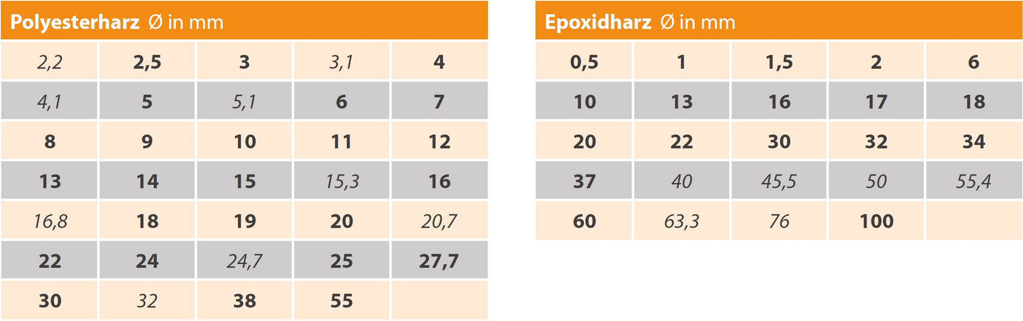- Bis Durchmesser 30 mm kann in Vinylesterharz produziert werden.